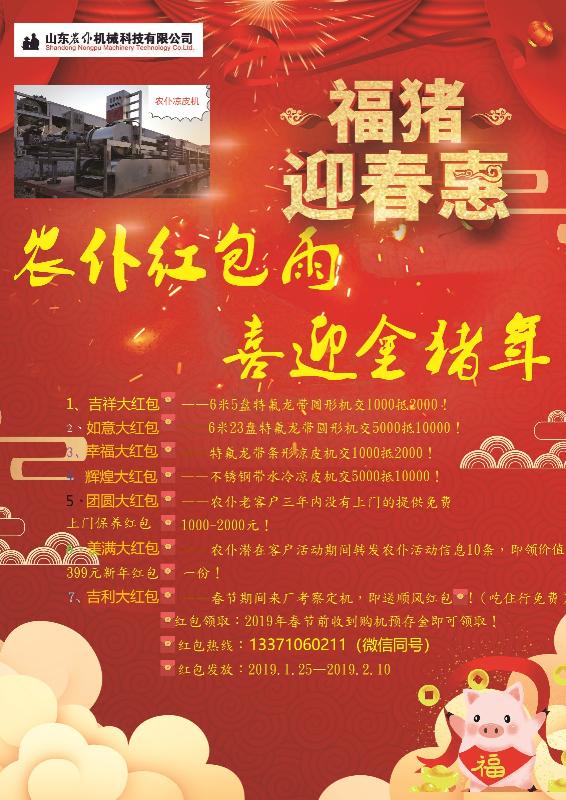 為迎接2019金豬年的到來,讓更多的朋友用上農仆涼皮機;山東農仆機械科技有限公司現隆重推出七重購機大紅包,手慢無——